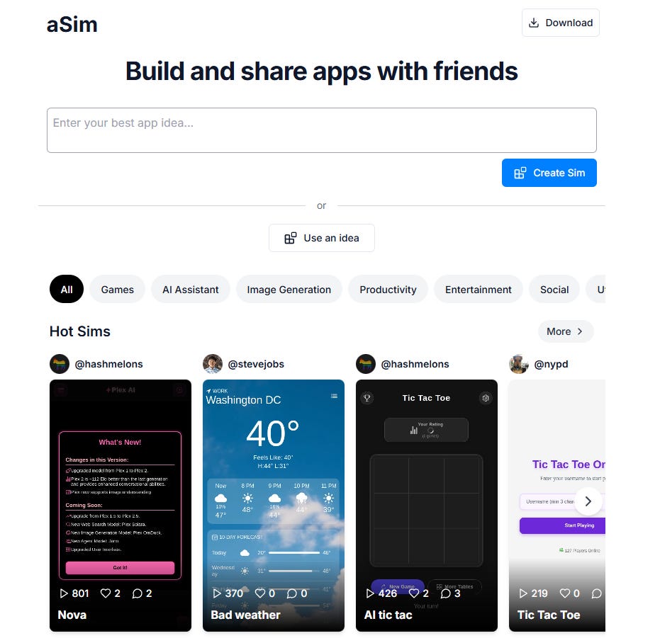 Below that, there’s a scrollable feed of user-generated apps, called Sims. These are presented almost like cards; with preview screens, user tags, and quick stats on views, likes, and remixes. Some are fun experiments like "Bad weather", a slick-looking forecast app, while others are throwbacks like "Tic Tac Toe" or early-stage assistant tools like "Nova". Clicking into them opens a full working version of the app in a simulated environment.